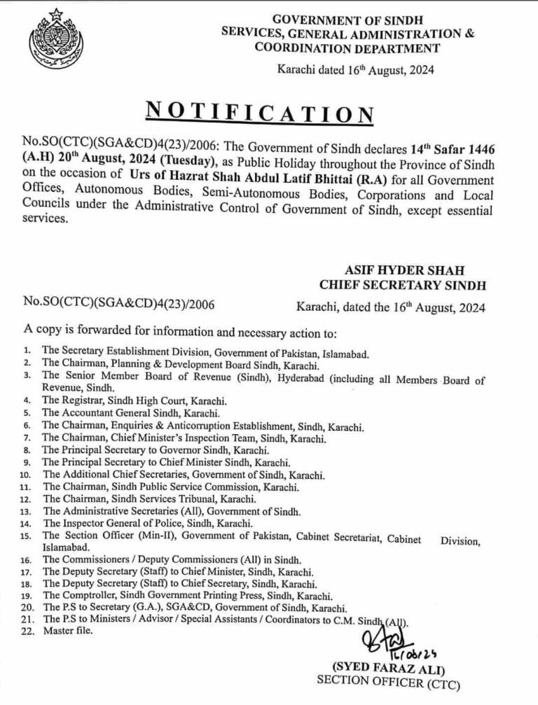 A notification regarding the August 20 holiday has been issued by the Sindh government.