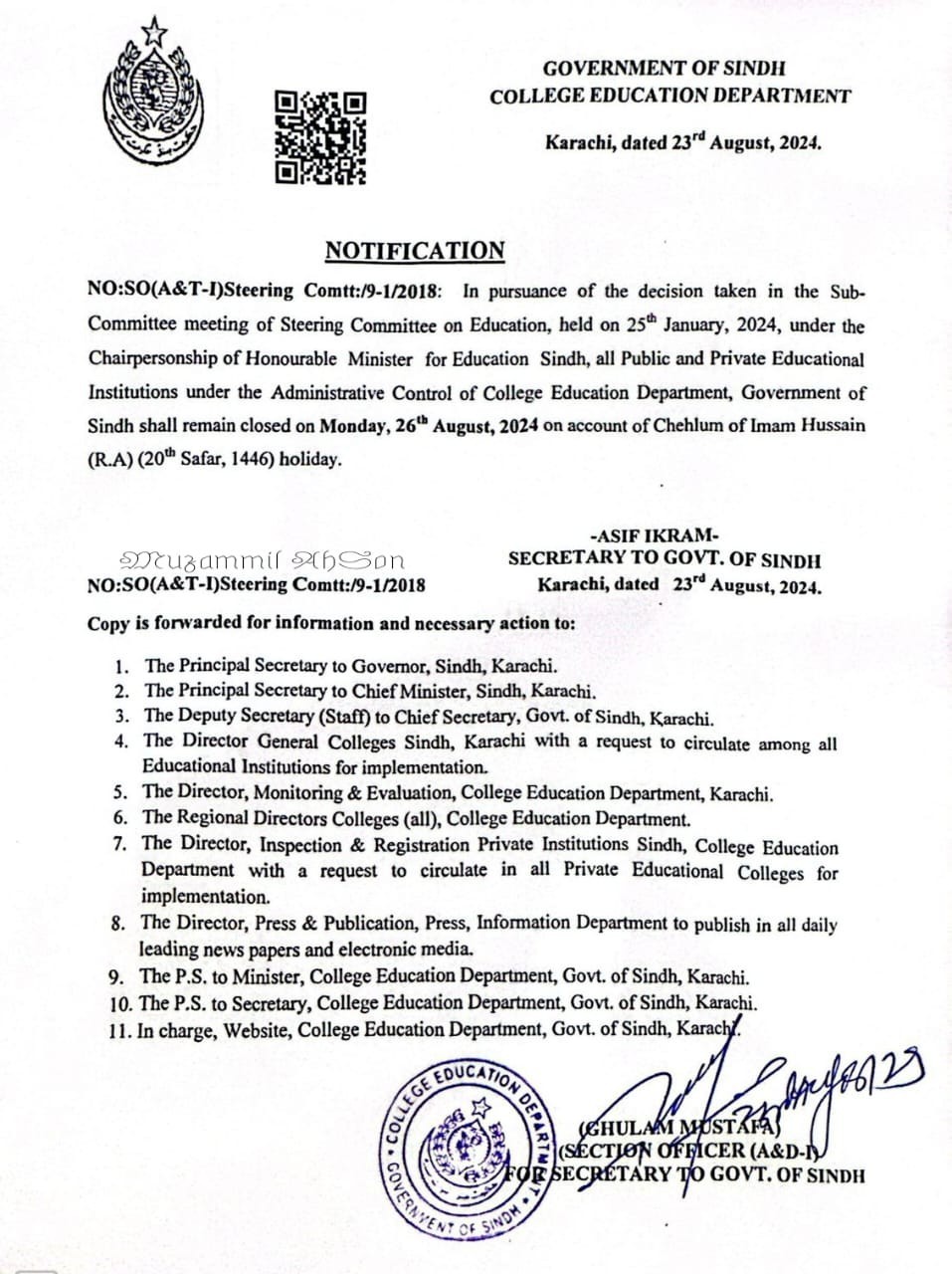 "All the public and private educational institutes under the administrative control of the College Education Department, Government of Sindh shall remain closed on Monday 26th August 2024," read the notification.