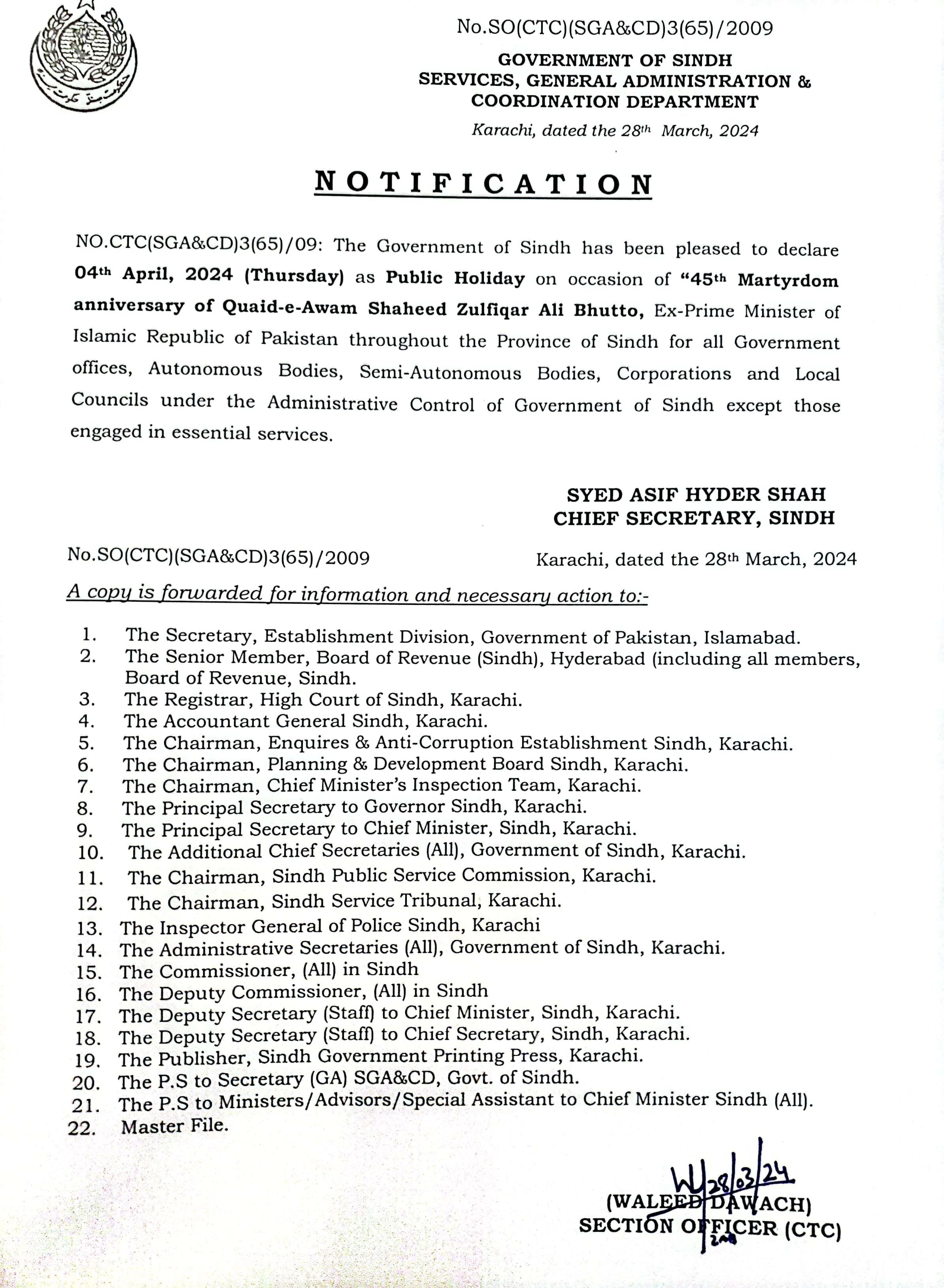 "The Government of Sindh has been pleased to declare 4th April, 2024 (Thursday) as Public Holiday on occasion of 45th Martyrdom anniversary of Quaid-e-Awam Shaheed Zulfiqar Ali Bhutto, Ex-Prime Minister of Islamic Republic of Pakistan throughout the Province of Sindh [...]," the provincial government said in a notification.
