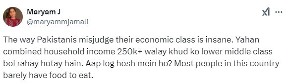 Many criticised those earning a substantial Rs 250,000 monthly yet labeling themselves as ‘lower middle class,’ pointing out that a considrable portion of the population struggles to afford basic necessities like food on much lower incomes.