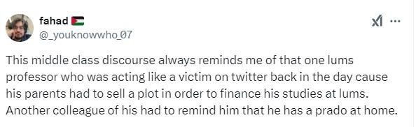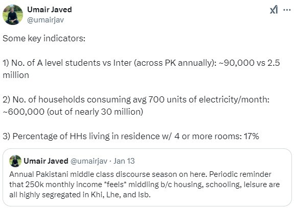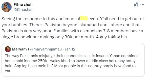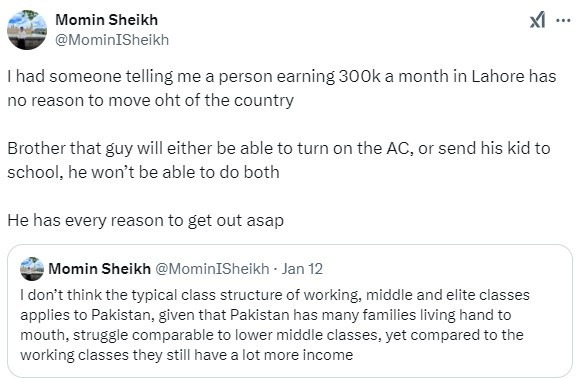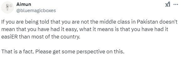 “I don’t think the typical class structure of working, middle, and elite classes applies to Pakistan,” argued X user @MominISheikh. “Many families live hand-to-mouth with struggles comparable to the lower middle class, yet they still have more income than the working class.”