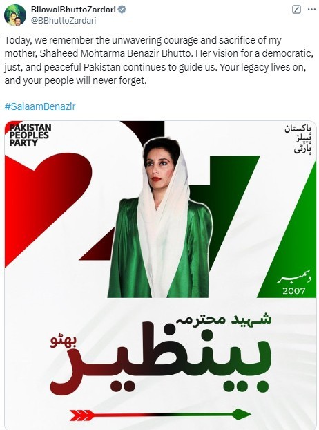 “Today, we remember the unwavering courage and sacrifice of my mother, Shaheed Mohtarma Benazir Bhutto. Her vision for a democratic, just, and peaceful Pakistan continues to guide us. Your legacy lives on, and your people will never forget,” his post read.