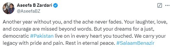 “Another year without you, and the ache never fades. Your laughter, love, and courage are missed beyond words. But your dreams for a just, democratic #Pakistan live on in every heart you touched. We carry your legacy with pride and pain. Rest in eternal peace,” she wrote in a post on X.