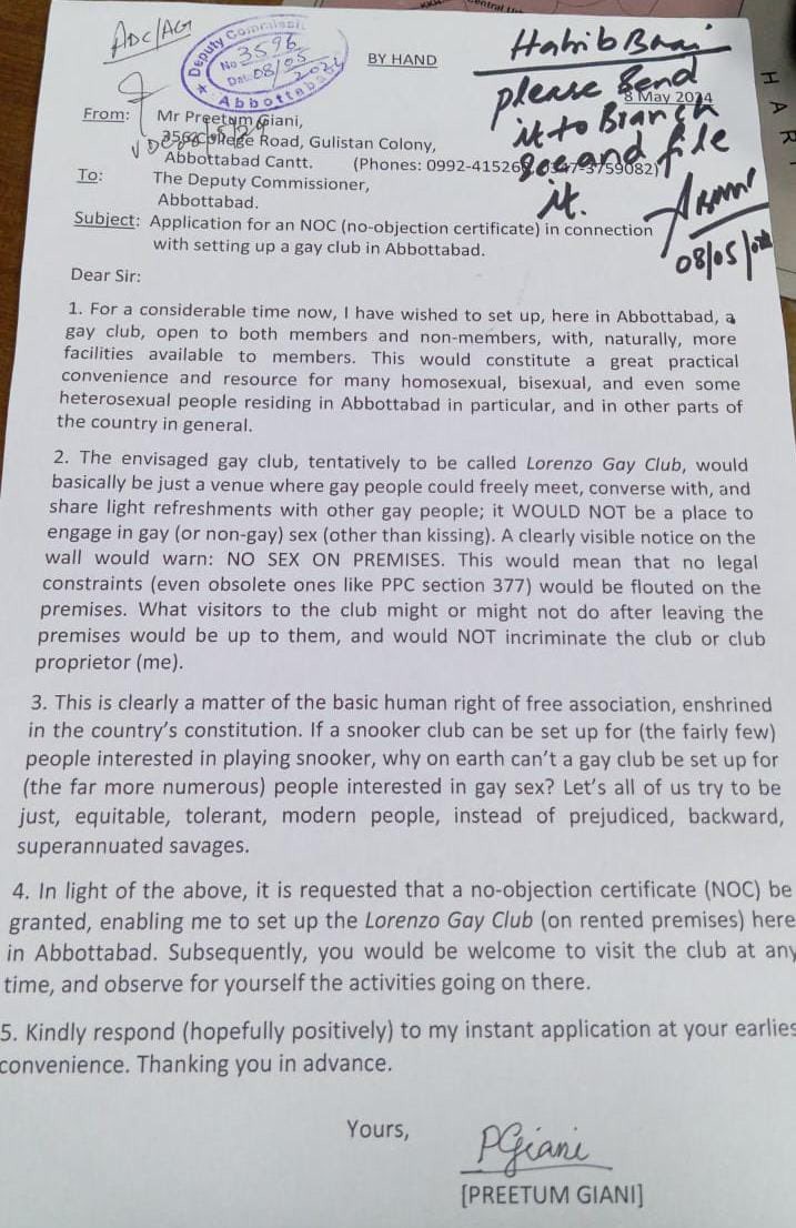 The applicant stated in his letter that the club will be a “great convenience and resource for many homosexual, bisexual and even some heterosexual people residing in Abbottabad in particular, and in other parts of the country in general.”