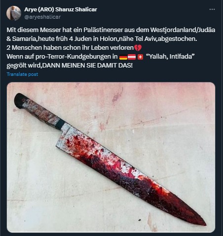 Shalicar took to his X (formerly Twitter) account to share a picture of a knife, falsely claiming it was used by Palestinians to stab Israelis in the West Bank.