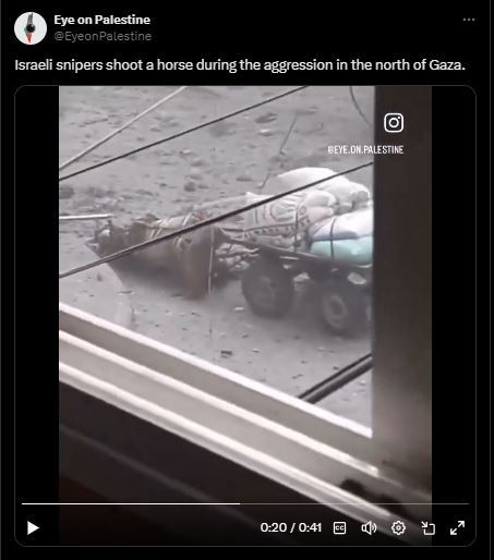 A horse carrying sacks of flour received as humanitarian aid for Palestinians was shot dead by Israeli snipers in the north of Gaza.