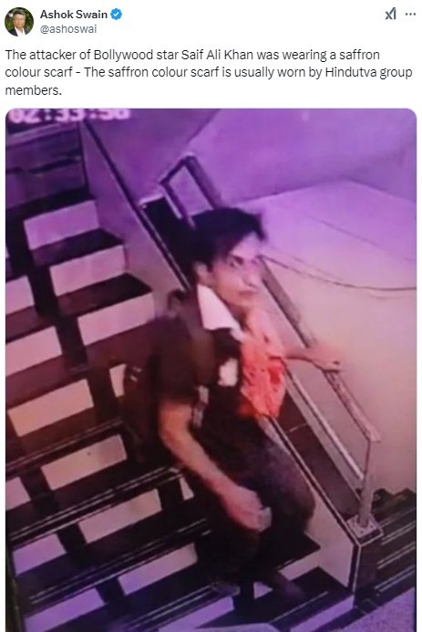 “The attacker of Bollywood star Saif Ali Khan was wearing a saffron-coloured scarf. This scarf is commonly associated with members of Hindutva groups,” Ashok Swain wrote on X.