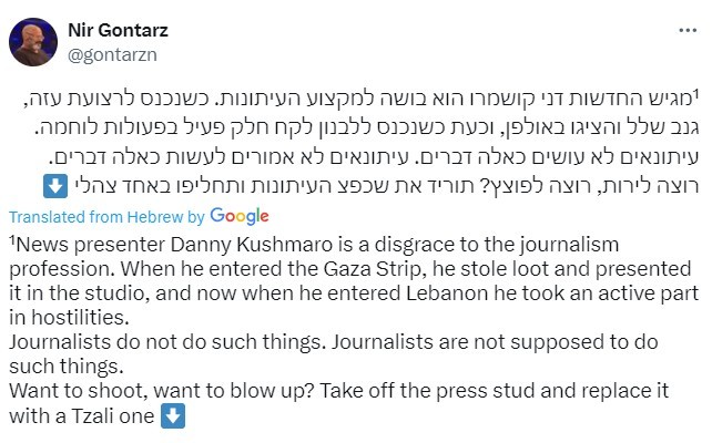 Journalist Danny Kushmaro, a popular news anchor in Israel, was seen wearing a press vest while standing alongside Israeli soldiers as he prepared to launch an attack on Lebanon.